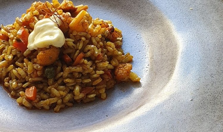 6. Tras estos pasos dejamos reposar y para la presentación mezclamos la mayonesa con el wasabi y acompañamos con una porción pequeña. La idea es que acompañe al arroz, no estilo all i oli para el arroz a banda. Un toque sutil que lo hace agradable y fresco.