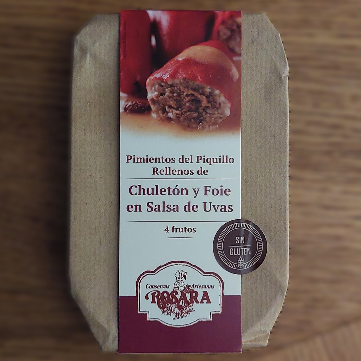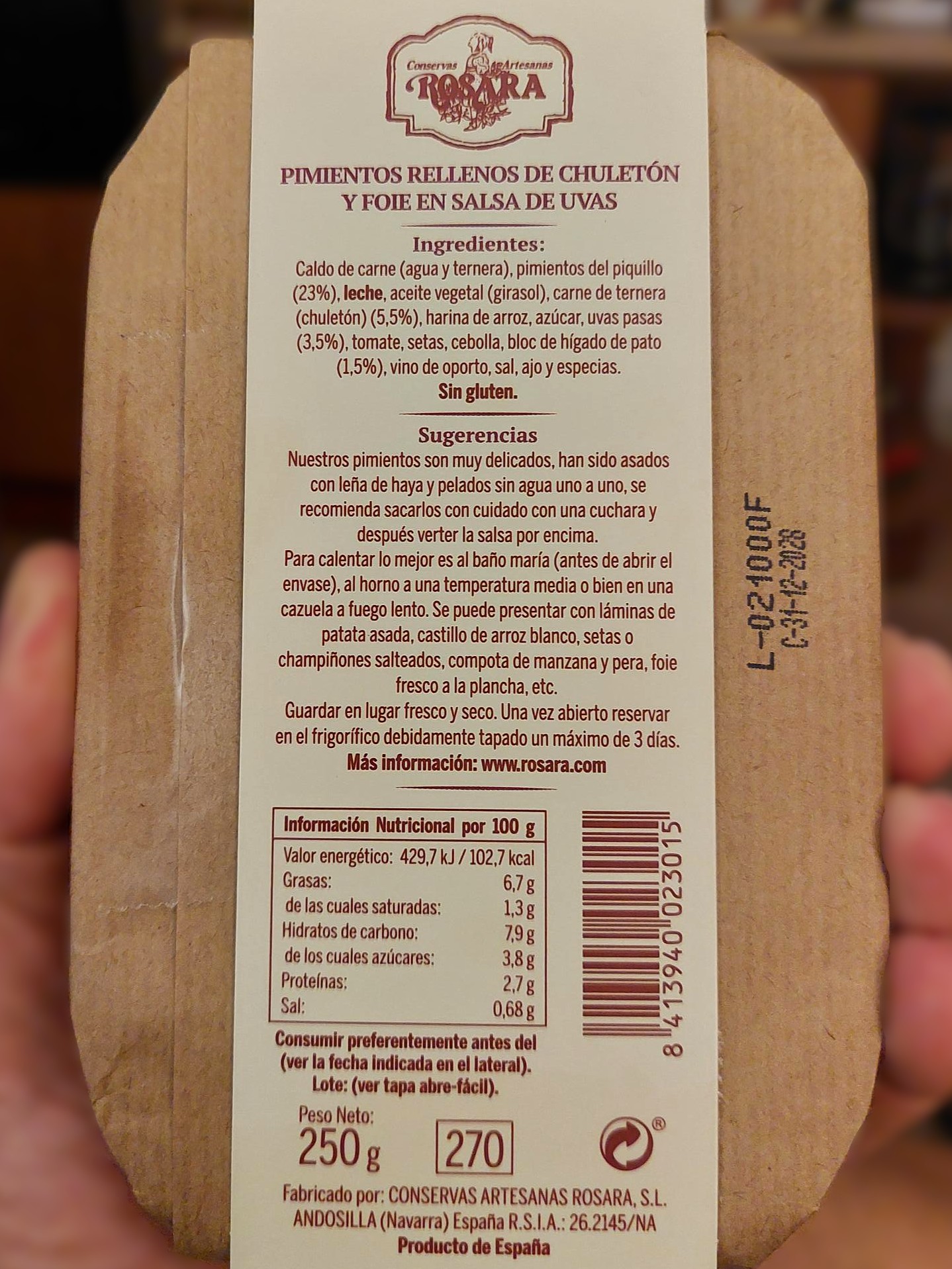 Mi sorpresa fue cuando a los dos o tres días de verla en Beals vino un cuñado mío a pasar un finde a casa y me trajo una especie de lote-laterío regalo, porque se dedica a temas de distribución de alimentación y tal, e incluía esta referencia de los pimientos rellenos de chuletón.