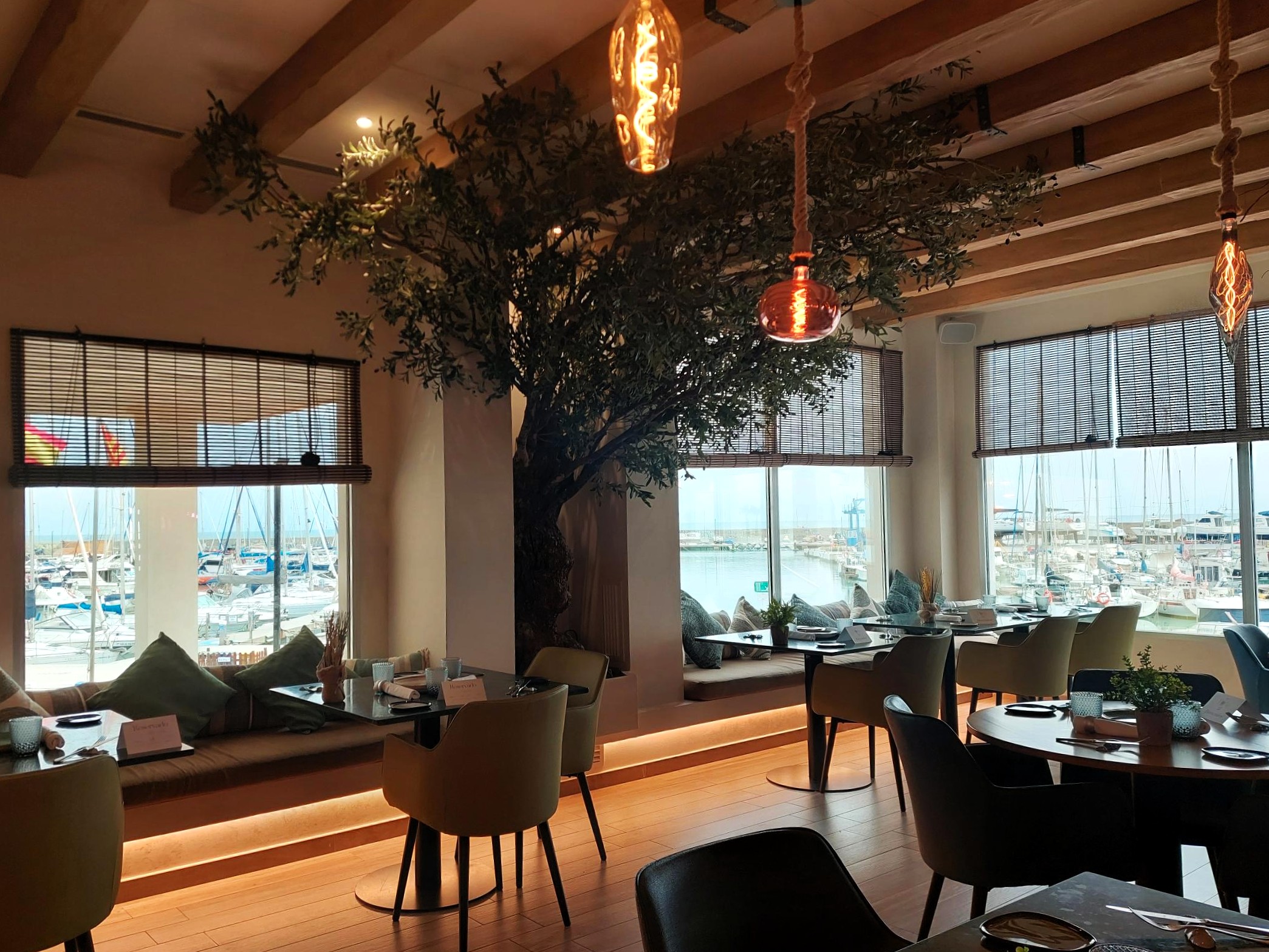 Recién reformado, se trata de un emplazamiento magnífico, en el Club Náutico, colgado sobre las embarcaciones de recreo, con unas vistas estupendas gracias a los grandes ventanales frontales de la sala, sala bien acondicionada y decorada con gracia, combinando motivos marineros con coloridos cuadros abstractos, mucha vegetación (incluso un árbol) artificial, unas chimeneas de diseño muy guapas… Y mesas muy cómodas con correcta dotación. Vamos, que tan ricamente.