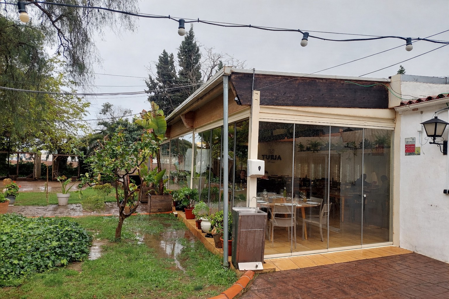 Tiene un antiguo bar-restaurante muy rústico y, anexo, como una prolongación a modo de cobertizo acristalado rodeado de vegetación, que es donde nos acomodamos.