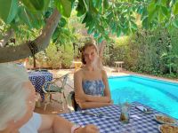 Ha habilitado una zona del chalet que ocupa que tenía “muerta”, detrás, a los pies de la piscina y bajo las ramas y profunda sombra de un gran ficus, en la que no se puede estar más a gustito.