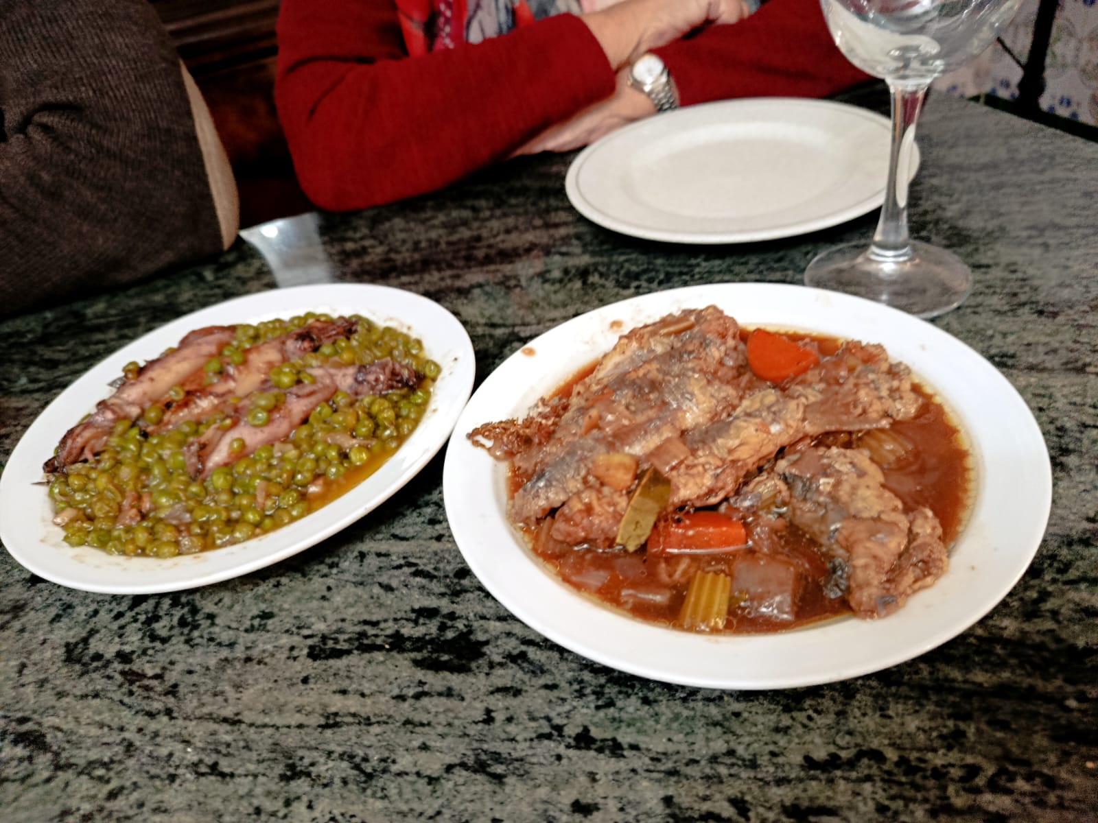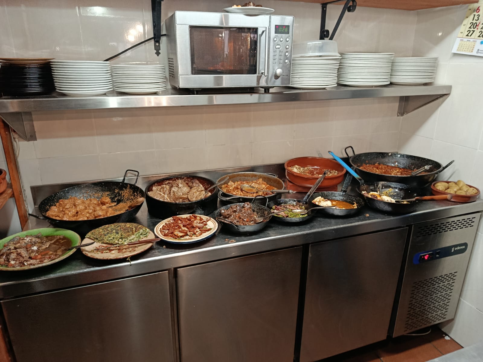 Tienen detrás de la barra un pequeño mostrador con los platillos. Eliges y te los llevan a la mesa. El día en que acudí tenían albóndigas con pulpo, callos de ternera, tortilla de verdura, guisantes con calamarcitos, migas, pies de cerdo, lomo de cerdo, escabeche de sardinas y no sé si algo más.