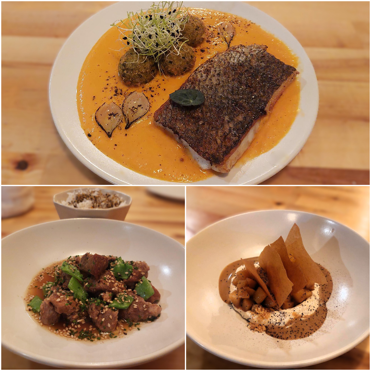 La corvina, a la plancha, acompañada por unas albóndigas de arroz apelmazado con cilantro cubierto de brotes de cilantro y bañada por una salsa cremosa de tomate, pimiento, leche de coco y caldo de pescado… fue una putta lokura de rica; el guiso de cerdo con soja, jengibre y ajo no podía estar más sabrosón, voluptuosos los bocados, a lo que no le encontré ninguna gracia fue al bowl de arroz con furikake, y eso que ese fue el único plato y la única vez que vi salir a la sala a Natália, muy maja también, y fue en lo que más hincapié hizo, en el arroz y el furikake casero; y el postre, logrado y evolucionado, con ese juego de dulce y no dulce, de melosidad y crunch, “manzana, crumble, canela y tahine”.