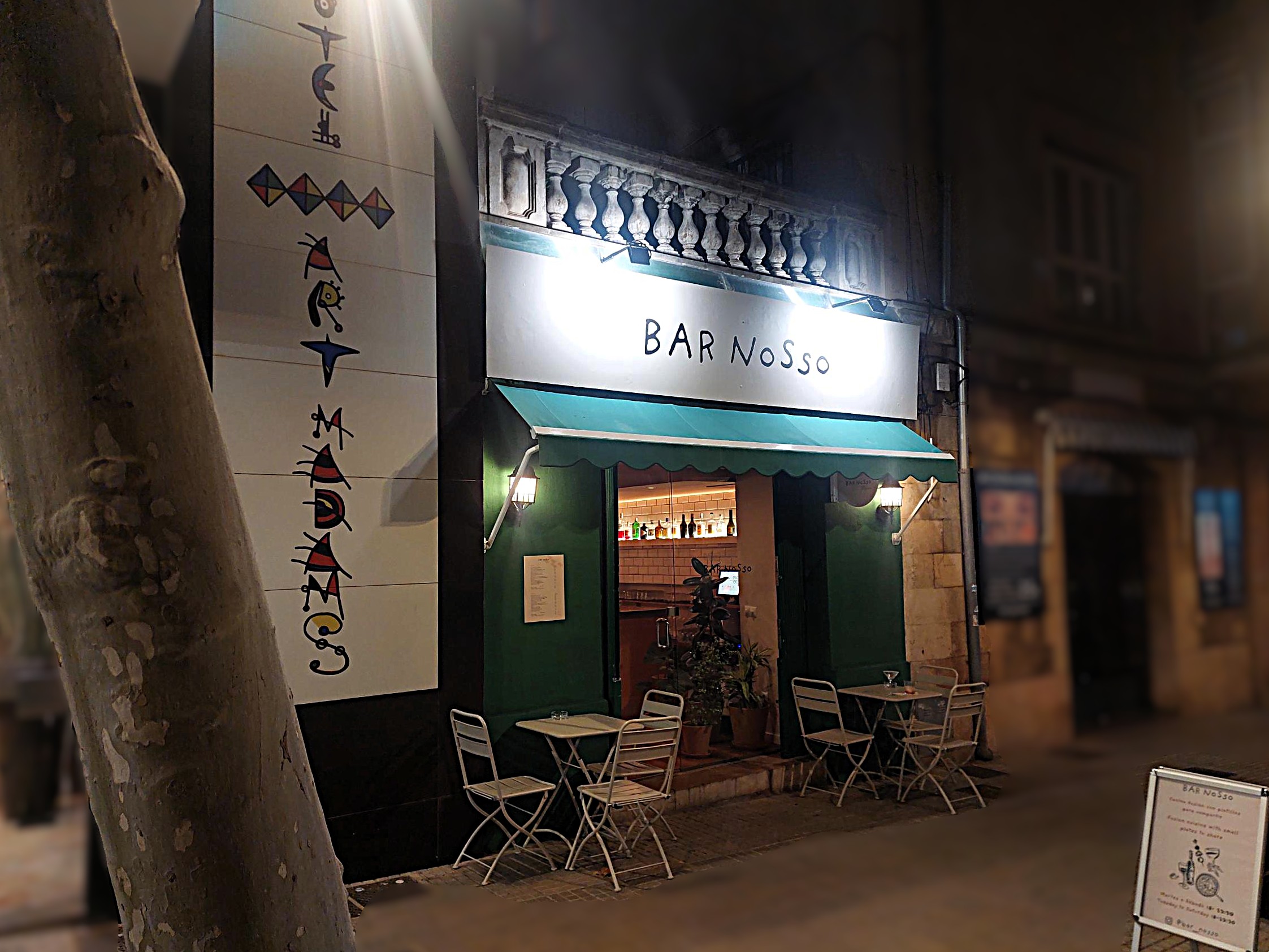 Pero yo de todo esto no tenía ni la más remota idea, no sabía ni que existían. Yo simplemente, tras una jornada de trabajo intensísima en Palma, donde aterricé de buena mañana yendo a currar sin solución de continuidad, había por fin hecho el check in y dejado corriendo la maleta en el hotel, en la subida al Castillo de Bellver, me había puesto unas zapas, y bajaba paseando alegremente hacia Santa Catalina a buscar algún lugar chuli para cenar algo, que no va a ser todo trabajar, oye. No había tenido tiempo de buscar nada, pero sabía que en la zona comentada había mucha oferta. Al poco de salir del hotel, me llamó la atención este Bar Nosso, pero ponía en el cartelillo de la acera “cocina fusión” y eso me hizo descartarlo y seguir mi camino. Ya en Santa Catalina, me llevé un chasco porque era todo como muy, no sé, ¿previsible?, ¿prêt-à-porter? Ninguno me hacía ninguna gracia y pensé… ¿y esa tabernilla tan cuqui de la bajada, aunque sea fusión? Oye, por lo menos se veía algo como muy “personalizado”, se veía cariño. Recordaba su nombre, lo busqué Google y llamé para comprobar si había sitio porque al pasar vi bastante gente para lo chiquito que era, y me dijeron que sí, así que vamos para arriba.
