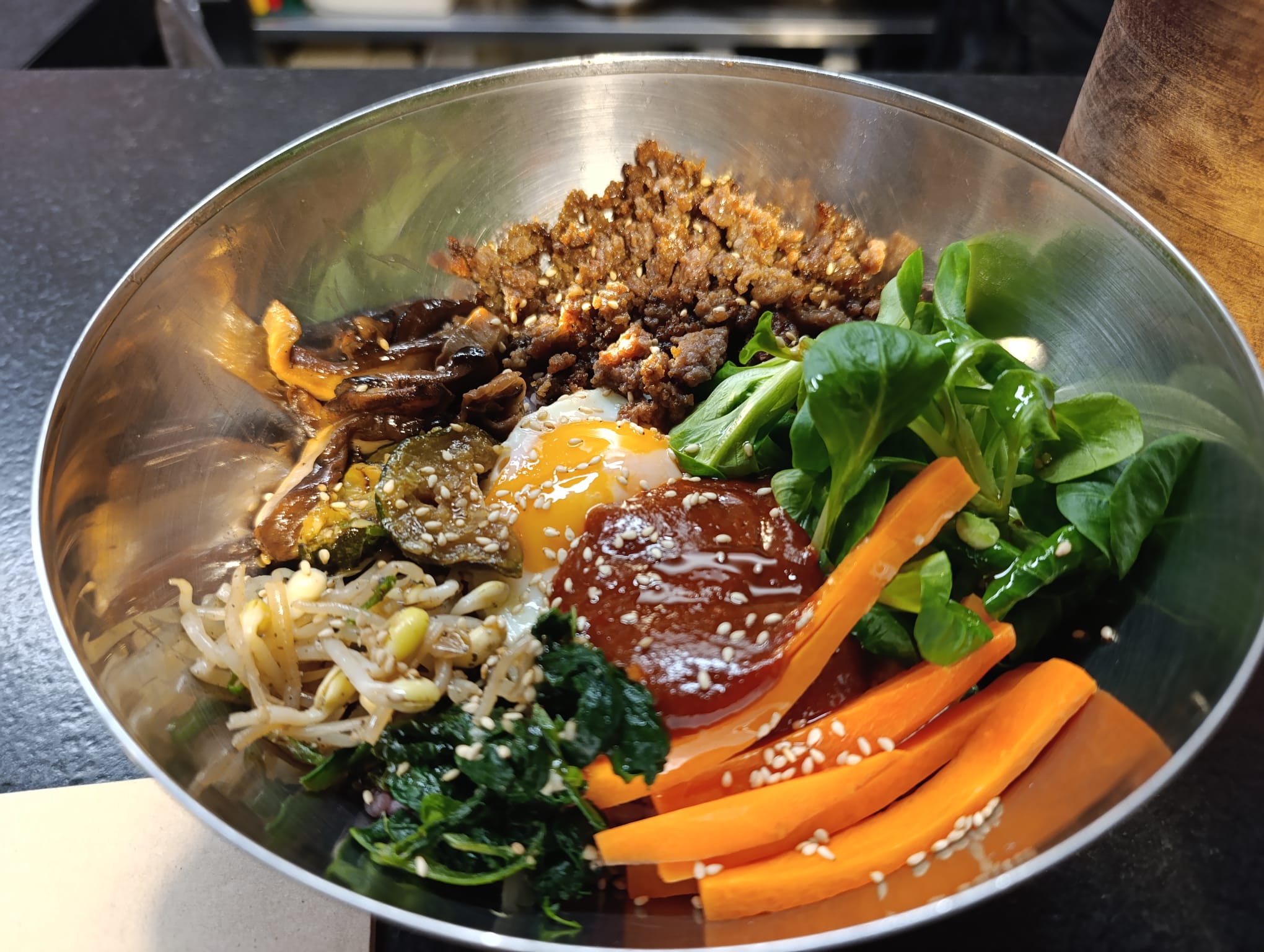 – Bibimbap. El arroz con cosas coreano, con una base de arroz y diversos ingredientes mezclados. Nosotros pedimos el de bulgogi, la barbacoa coreana. Carne picada. Además verduras, huevo frito y una salsa de gochujan picantita. Rico, sabroso.