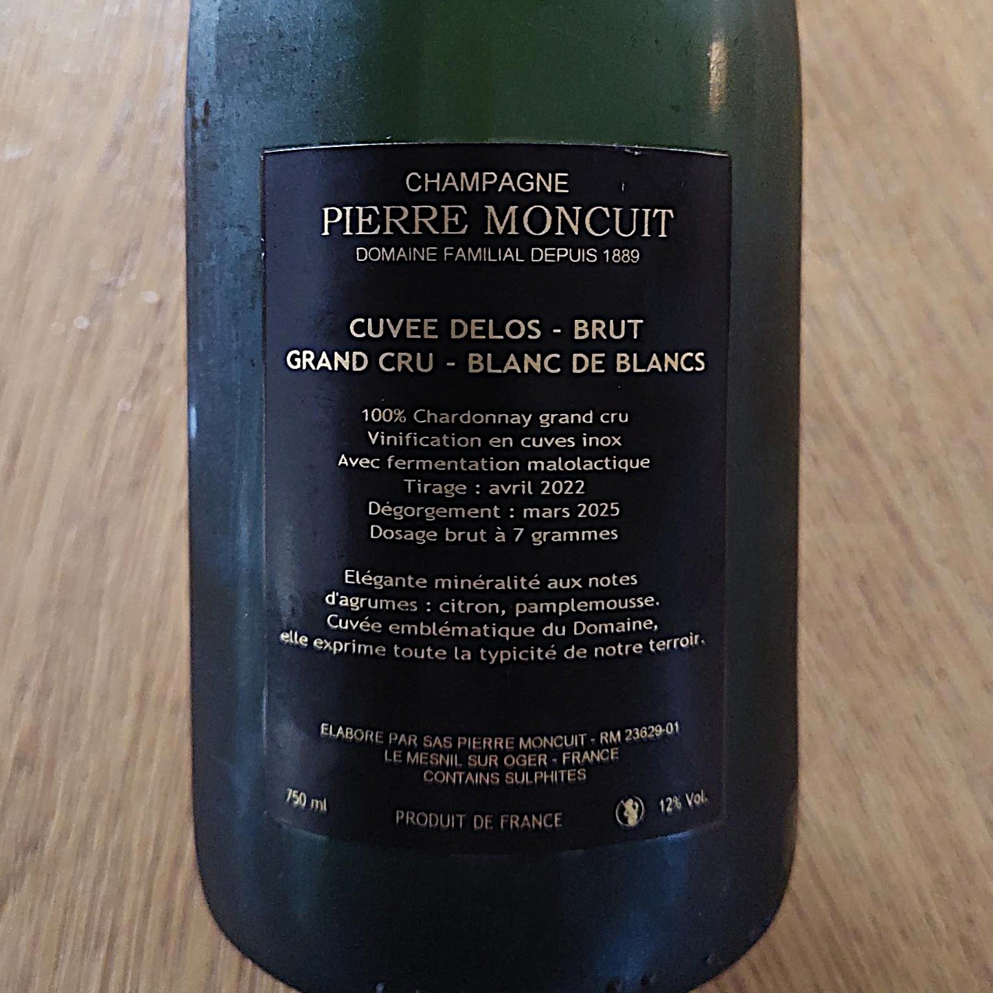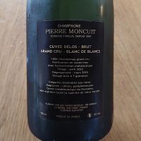 Lo pillé en Beals, que siempre trae cosas chulas y bien de precio para Navidades, a 43 €, junto con otro de esta misma casa que costaba 5 € menos, Pierre Moncuit Hugues de Coulmet que no es Grand Gru pero también es Blanc de Blancs, y está bien, pero parece que en lugar de 5 se lleven 50 €. Nunca emplearás mejor 5 € que estirándote del Hugues de Coulmet al Delos.