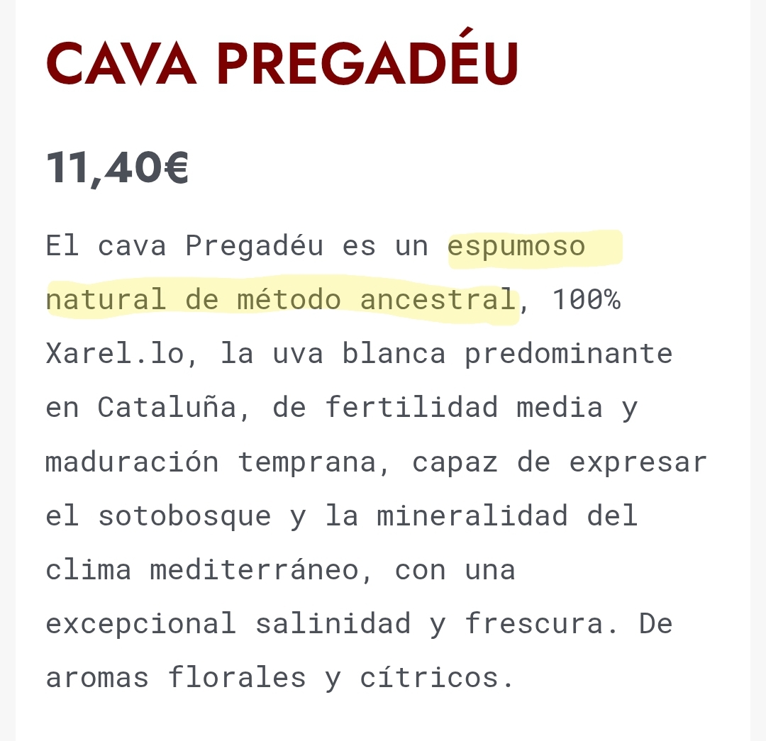 Pero el caso es que es natural, ancestral y Cava (como ves en la foto de la etiquetas, pone Cava, aunque no añade “DO”, quizás ahí allá trampa, no creo, porque es una práctica habitual, me quiere sonar de hecho que hay lío con eso).